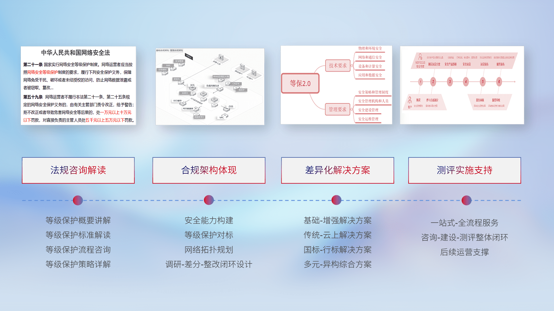 通过专业的法律咨询解读、、合规架构体现、、差异化解决方案、、、测试实施支持等服务,,,,为客户量身打造等保合规体系。。。
